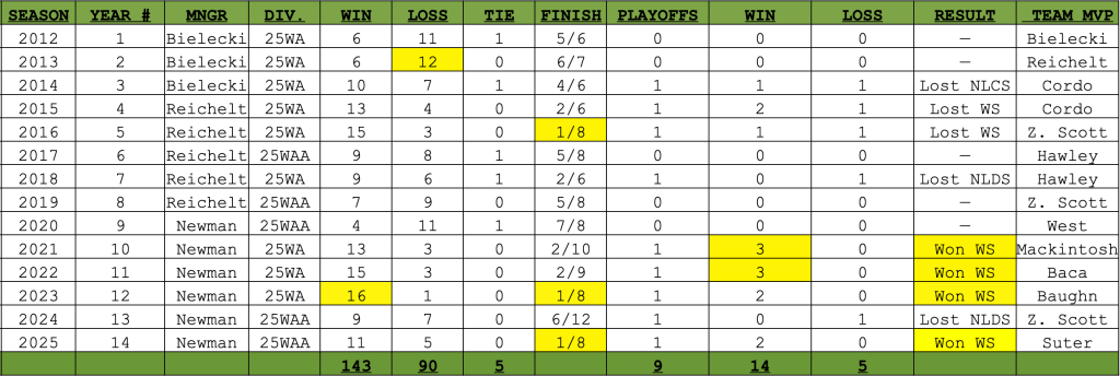 Over the club’s 14 seasons, the team has made nine playoff appearances, won six pennants and captured four league championships in 2021, 2022, 2023 and 2025.