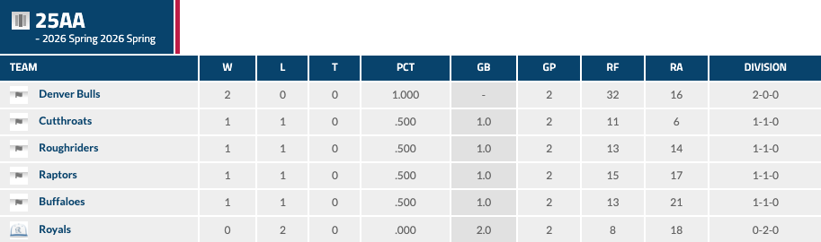 | April 12 | 9 AM | Cutthroats | Royals | Thomas Jefferson | W, 8-0 | Colin Suter |